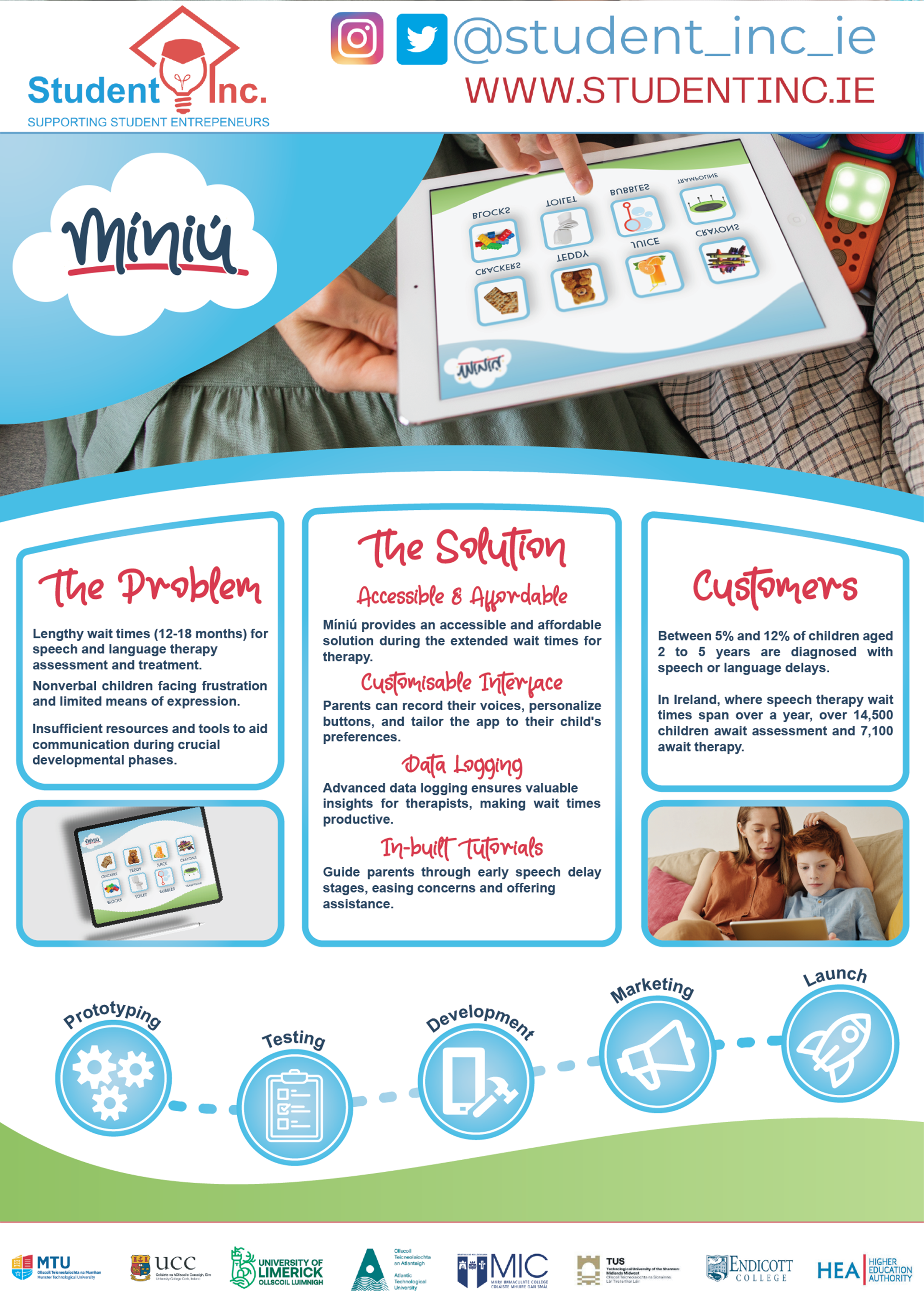 Míniú is an early-stage educational app concept designed to support children with speech delay through interactive, visual learning tools. Developed as part of the Student Inc. start-up programme at The Rubicon Centre, the project involved creating the full brand identity, UI design, and working prototype. The concept was pitched to investors and industry mentors, earning the MTU President’s Award for Innovation.